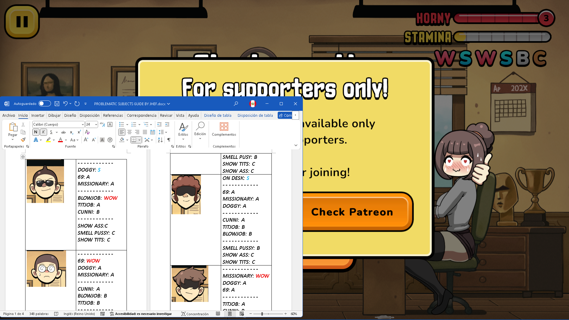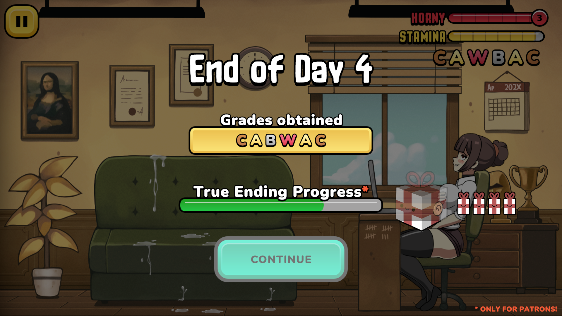 you should also add parameters so that we can able/enable fetishes ans add lesbian and trans srudents that we can also enable if we want, I suggest to also add a gallery where we could change the students and the prof appearance, I think it's appropriate to make the galery with animations and not just photos, one last thing, I think you could add new difficulties and modes to add longevity to the game, thx for reading my msg, looking foreward for the next update !